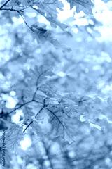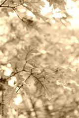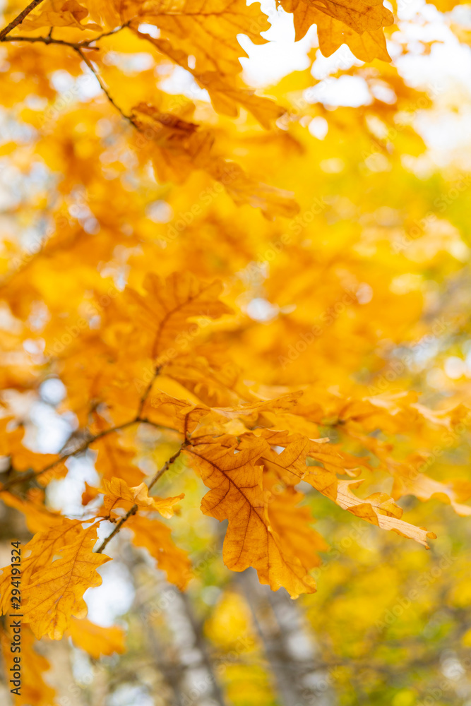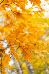 Yellow leaves of an old oak. Autumn background.
