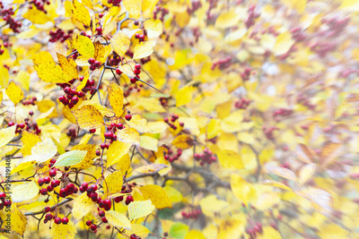 Red fruits of hawthorn. Yellow leaves. Autumn background.