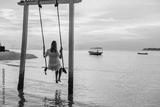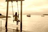 Girl relaxing in swings on sunset beach