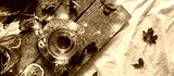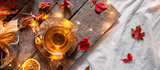 Cozy autumn or winter at home. A cup of tea, autumn casts a book a garland on a wooden table near a bed with warm plaids. Lifestyle autumn hygge lagom?concept of a holiday and autumn weekend.Banner