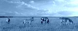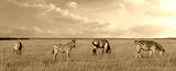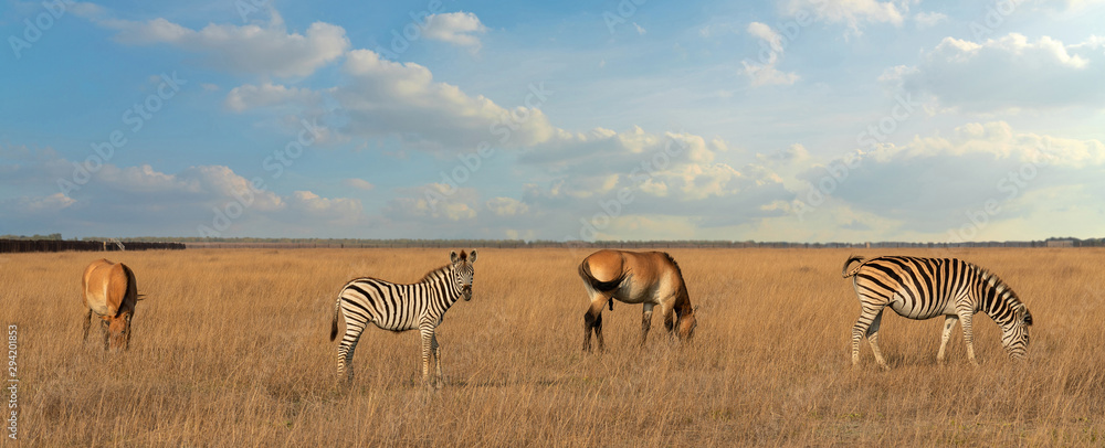 Przewalski's horses and zebras African herbivore animals group feeding and browsing on the grass, steppe landscape in autumn.