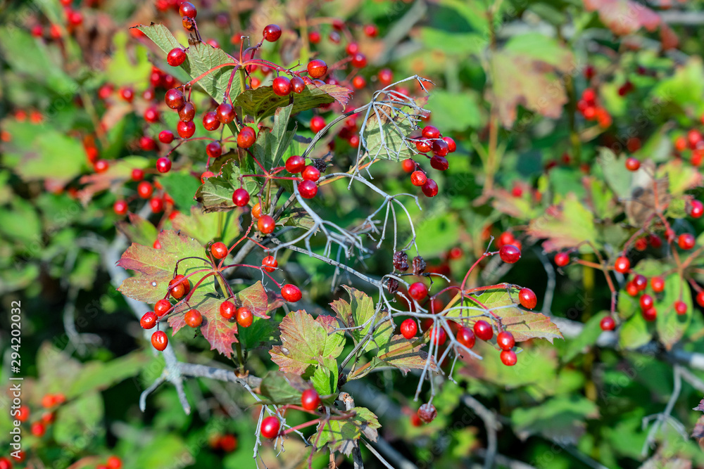 Red berries of highbush cranberry in autumn.