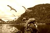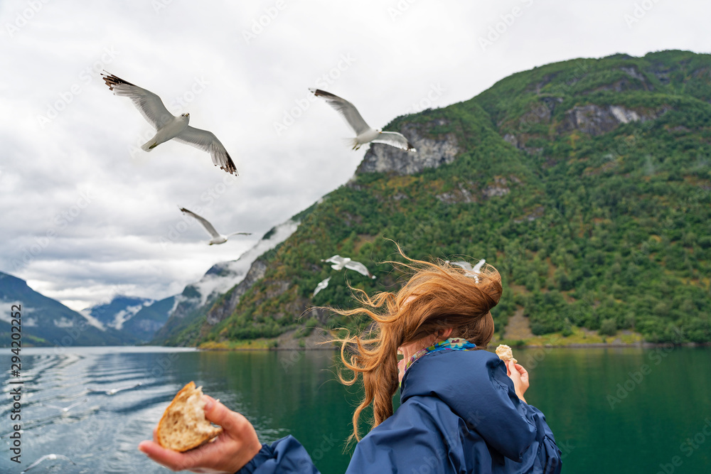 Girl feeding birds with bread in Norway. Sognefjord sea mountain view.