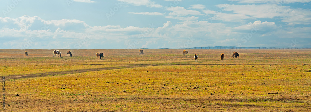 African herbivore animals - horses and antelope feeding on the prairie, autumn panoramic landscape.