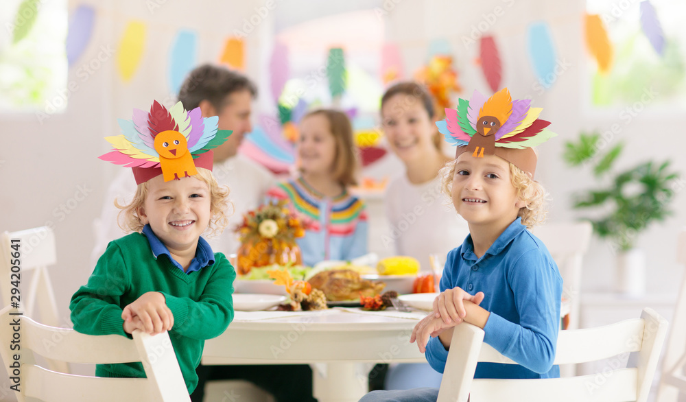 Family with kids at Thanksgiving dinner. Turkey.