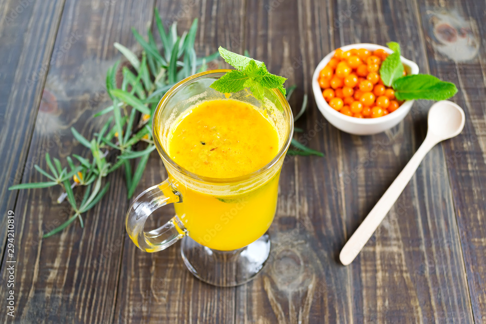 Fragrant tea with sea buckthorn and mint leaves on a dark wooden table. Healthy drink