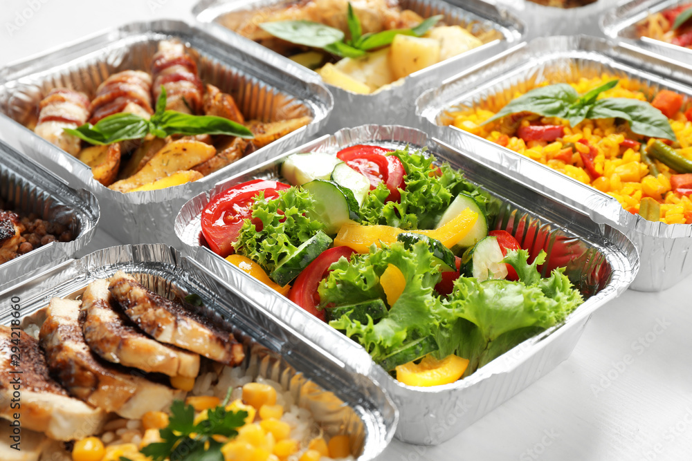 Lunchboxes on white wooden table, closeup. Healthy food delivery