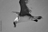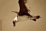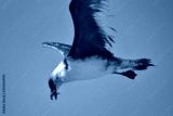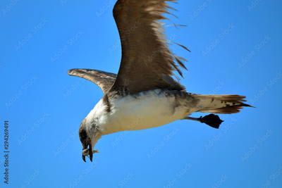 Arctic Skua bird flying with a fish in beak in Tramandai, Rio Grande do Sul, Brazil; blue sky on background