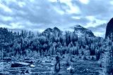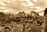 Woman walking in beautiful alpine meadows with yellow larch trees and mountains covered with glaciers. Fairview Mountain trail in Lake Louise area. Banff National Park. Alberta. Canada