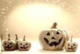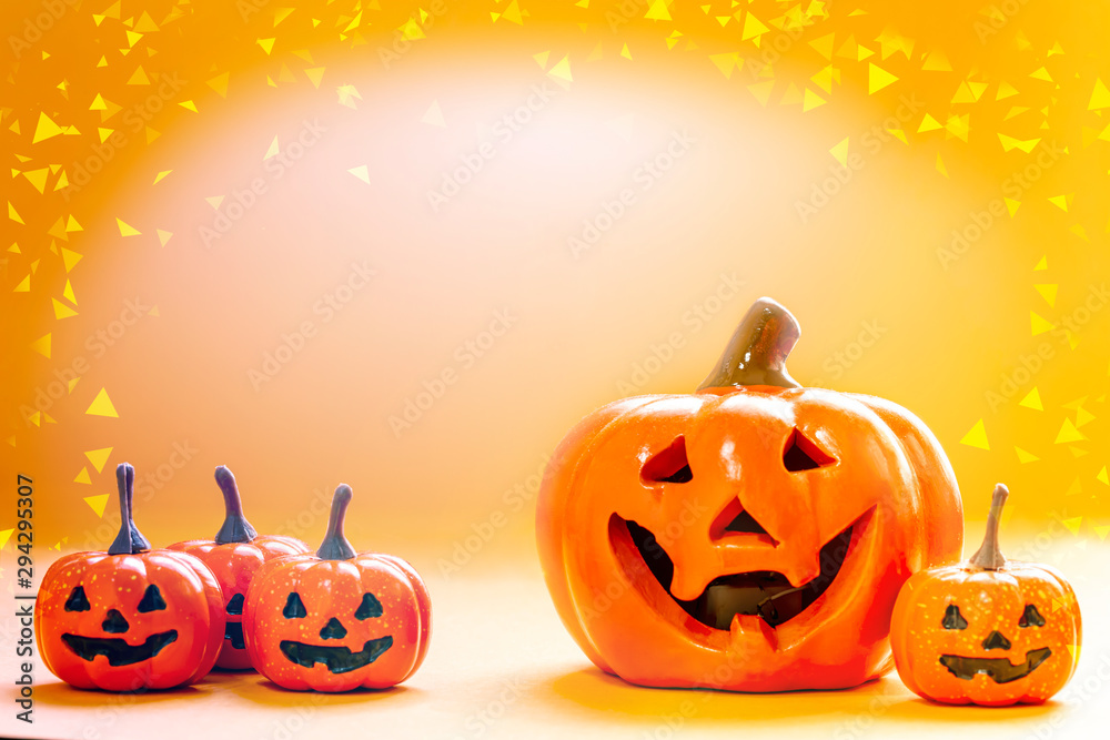 黄色オレンジ系のカラフルバックと沢山のオレンジのカボチャと大きいカボチャ