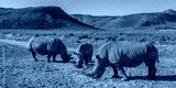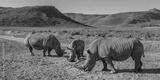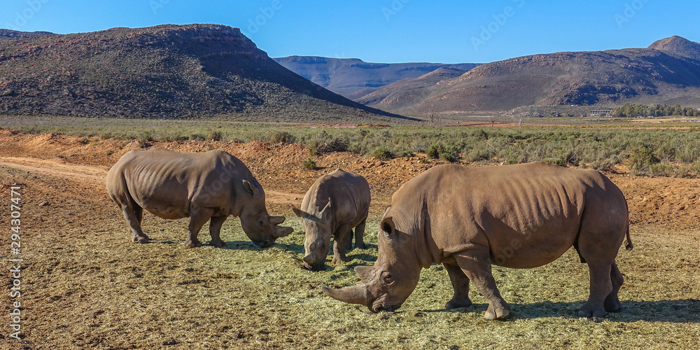 A white rhino / rhinoceros grazing in an open field in South Africa