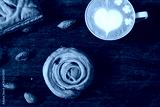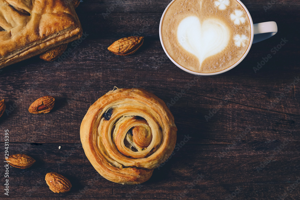 Bread Denis with Chocolate chips with hot coffee on wood background.
