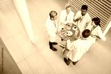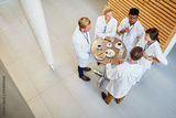 Doctors eat and talk together in the cafeteria