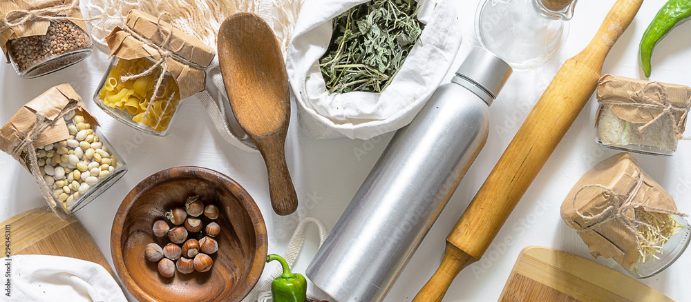 Vegetables and groceries in the kitchen. Storage in ecological friendly dishes, zero waste and no plastic concept, flat lay, top view