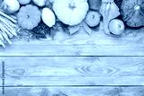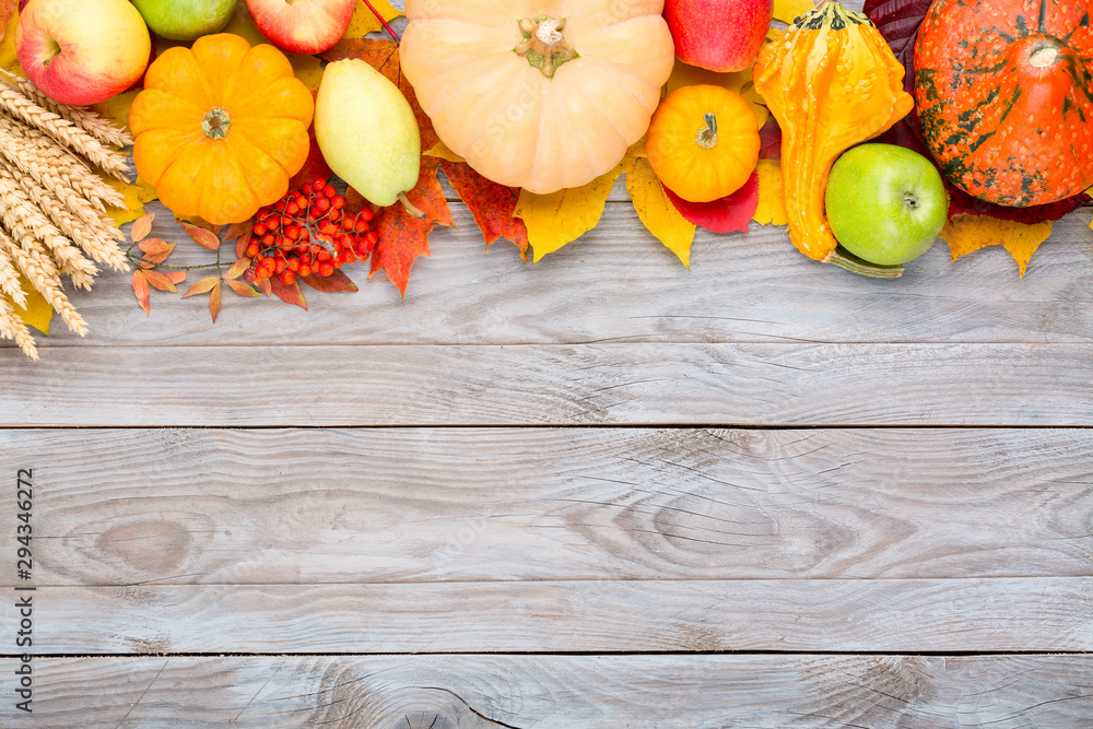Assorted raw organic fresh vegetables and fruits on wooden table. Fresh garden vegetarian food. Autumn seasonal image of farmer table with foliage, rye, pumpkins, apples, ashberry and pear. Copy space