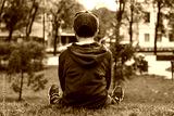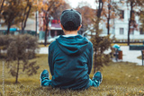 Boy sitting on the grass wearing blue hoody, jeans, black snapback and sneakers in the autumn park. Seasons and loneliness concept.