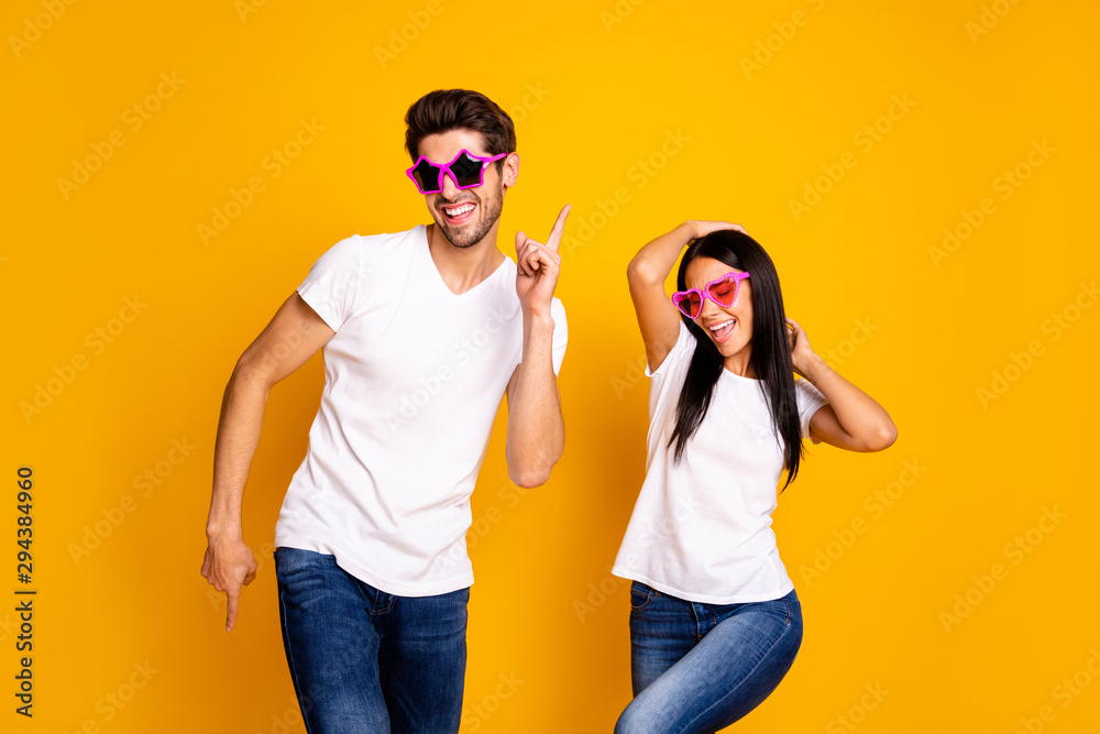 Photo of two people attend student party dancing and show sale advert wear cool specs and casual clothes isolated yellow color background