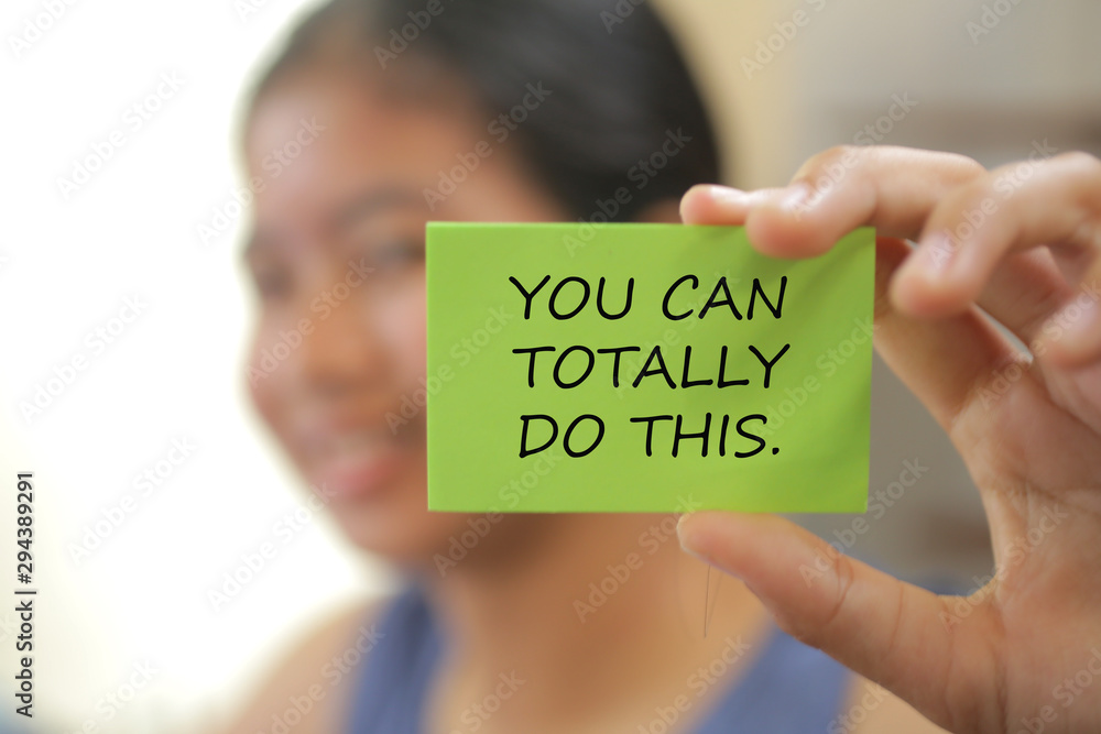 Blurry image of young girl holding a motivation sign with text on it - you can totally do this. encouragement and self improvement concept.