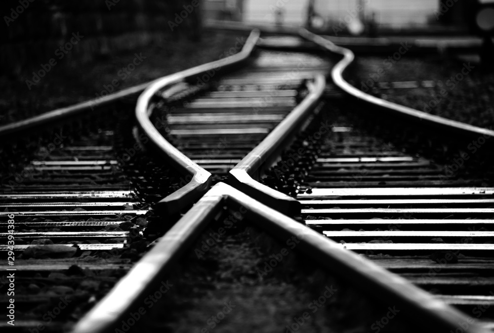 Schienen Gleise Bahnstrecke Nahaufnahme Weiche schwarz weiß Entscheidung Zukunft zusammenführen Stahl Schwellen schwarz weiß Kontrast Switch Weg Ziel Aussicht gemeinsam Symbol Reise