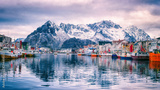Fishing boats at harbour of cozy small fishing village Henningsvaer in Lofoten Islands, Northern Norway. Amazing landscape with mountains and reflection in the water, travel winter background