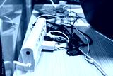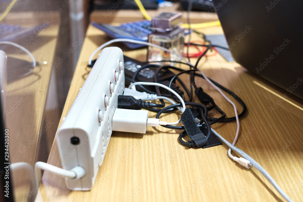 Many electrical wires plug into electric power bar on the table.