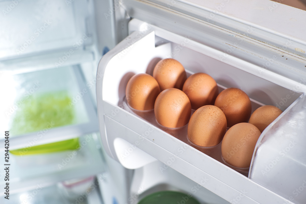 Fresh chicken eggs on the refrigerator shelf. Selective focus.