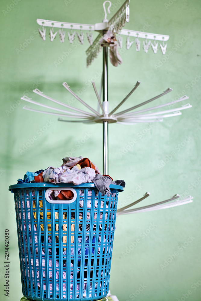 Full of wet baby clothes in the basket with blurred plastic stand cloth hanger in the back.