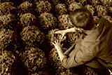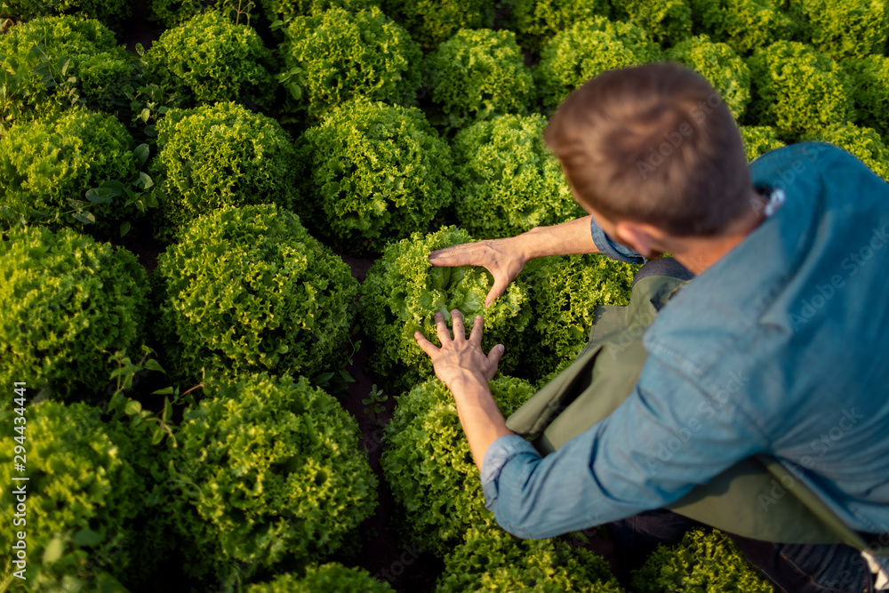 Male agricultural worker examining lettuce plantings on a field top view from behind