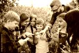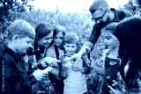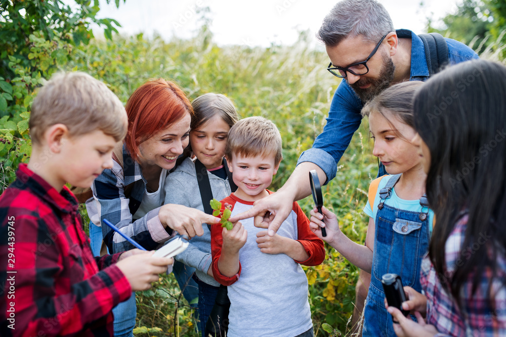 Group of school children with teacher on field trip in nature, learning science.