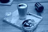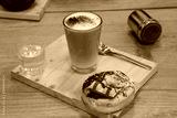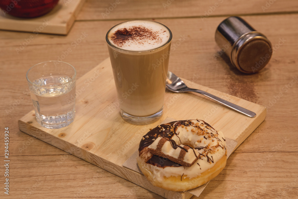 Glass of coffee with milk with glass of water on wooden table with glazed donuts. Wooden background