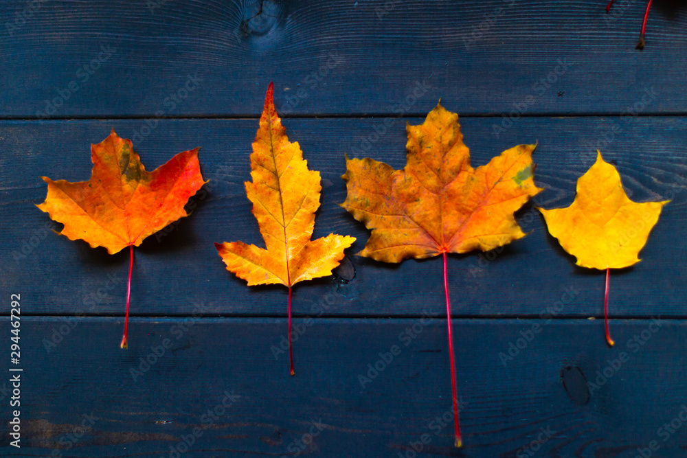 Multi-colored maple leaves on a wooden background, red, yellow, red, green.
