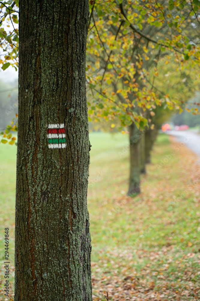 Tree alley with tourist mark on the tree trunk. Walking path.