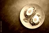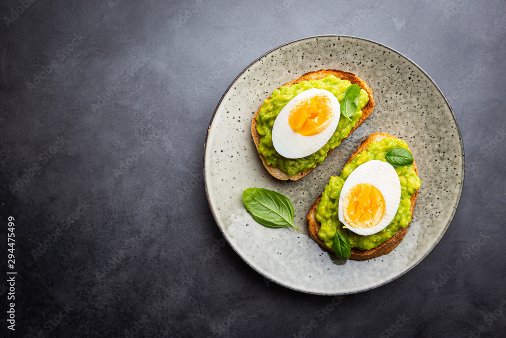Healthy breakfast, toast with avocado and egg, top view, copy space. Vegetarian food concept