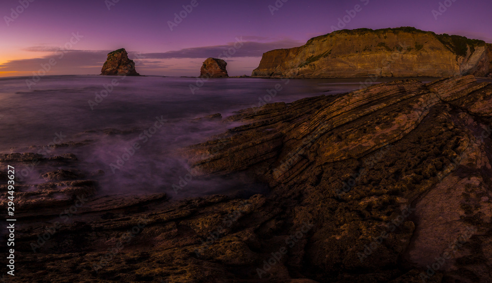 Panoramic of Two Sisters of Hendaye photographed at low tide with a purple sky. France