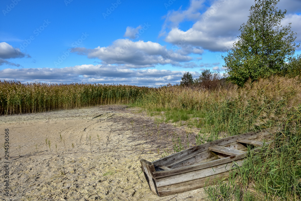 Lonely wooden boat on the drying lake Svityaz as a concept of ecological catastrophy. Natural disaster as a result of human interference in nature.