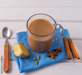 Masala chai tea in a mug, ginger, cinnamon sticks and anise over white table background.
