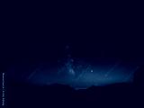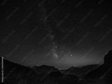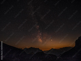 Golden evening light gently illuminates the mountains under the starry sky.