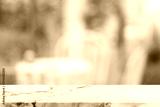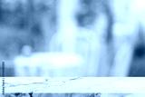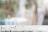 Empty white stone marble table top and blurred of interior restautant with window view green from tree garden background background - can used for display or montage your products.