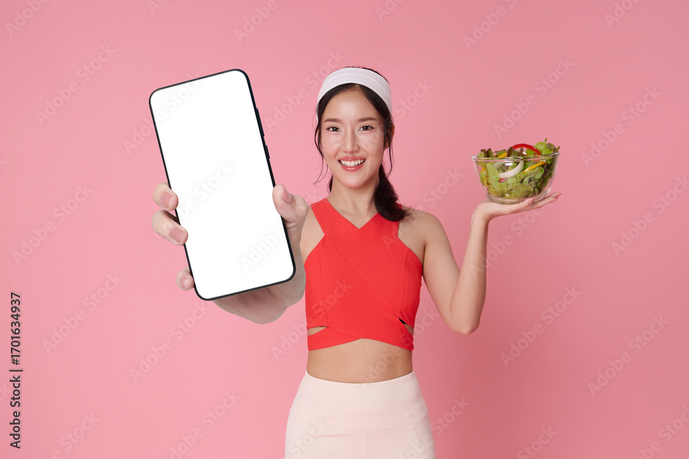Portrait of a happy young woman holding mobile phone and credit card isolated over pink background.