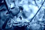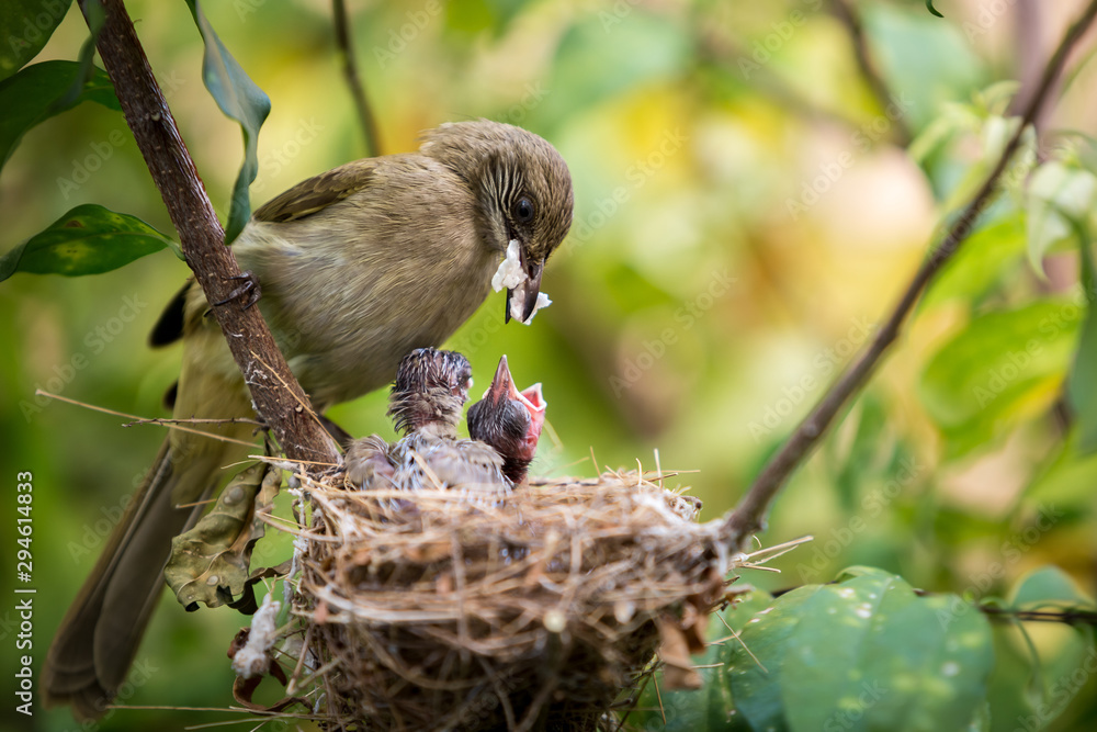 Mother bird feeding her newborn baby in nest on the tree.