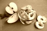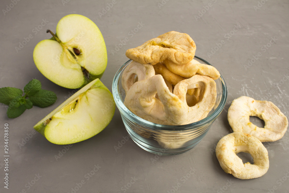 Apple chips in the glass bowl on the grey concrete background. Closeup.