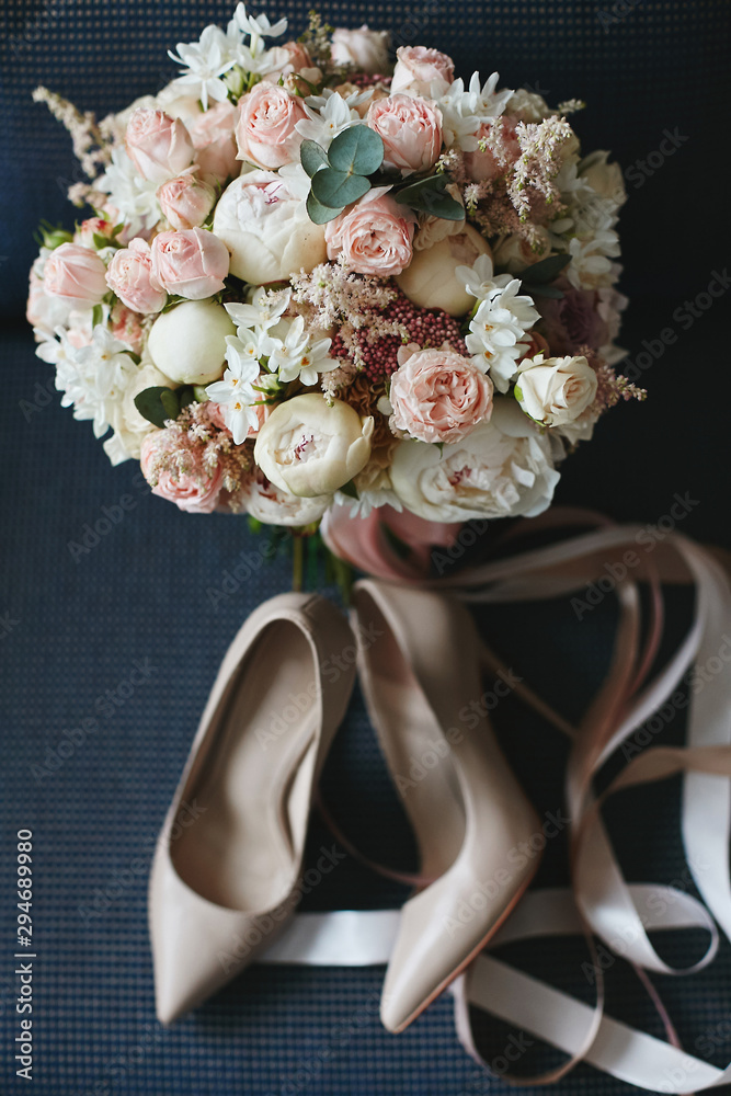 Composition from the bridal bouquet of beautiful peonies flowers with a pair of modish bridal shoes on a dark blue background. Concept of wedding preparation. Accessories for a bride