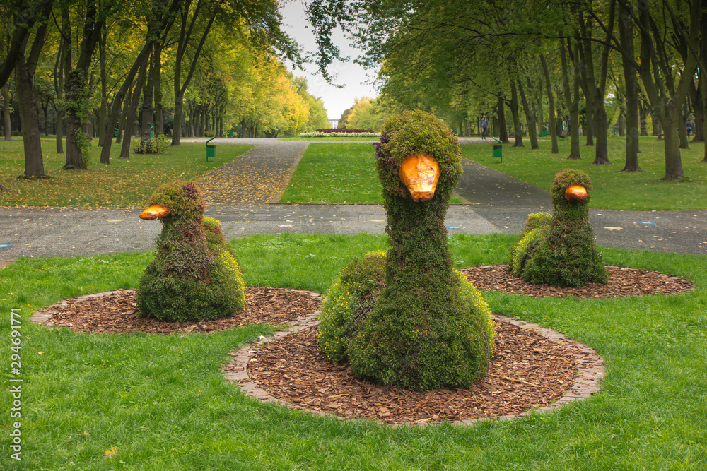 Ducks on the lawn made of wire and planted plants. Silesian Park in Chorzow