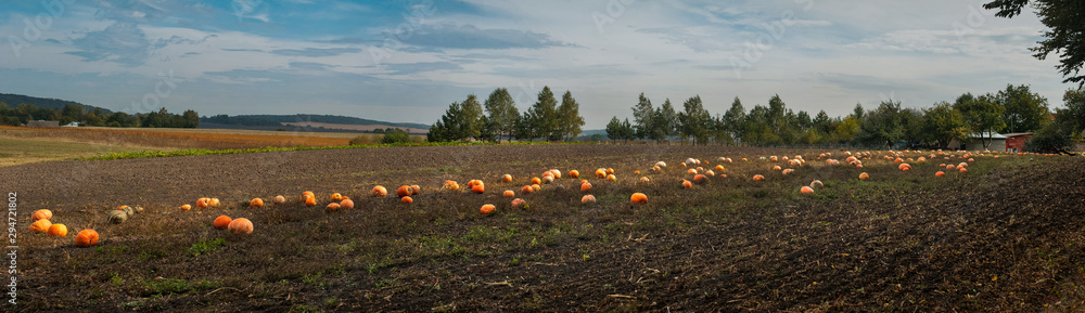 Pumpkins are scattered in the field. in the village harvest pumpkins in autumn day