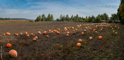 Pumpkins are scattered in the field. in the village harvest pumpkins in autumn day