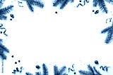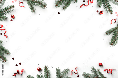 Creative frame made of Christmas fir branches on white background with red decoration, pine cones. Xmas and New Year greeting card, winter holiday. Flat lay, top view