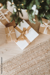 Christmas / New Year composition. Handmade winter holidays gift boxes and fir-tree branches. Festive concept.