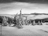Frosty winter sunrise in Carpathian mountains with snow covered fir trees. Impressive morning scene of mountains hills covered by fog. Beauty of nature concept background.