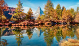Fabulous morning view of Grindjisee lake with Matterhorn / Cervino peak on background. Calm autumn scene of Swiss Alps, Zermatt resort location, Switzerland, Europe.