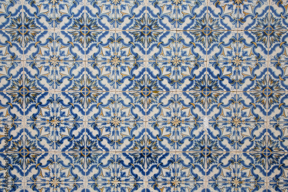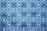 Ornate pattern, for design, backdrop. Abstract background from decorative painted tiles, close up. Fragment of old building wall, with traditional Portuguese, glazed ceramic tiles. White and blue colo
